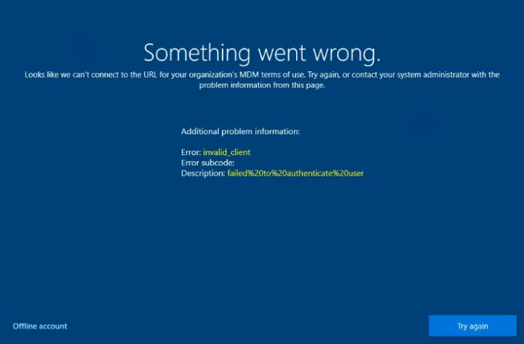 Nachdem die Benutzeranmeldeinformationen in der Intune AutoPilot-Registrierung validiert wurden, wird die folgende Fehlermeldung angezeigt: invalid_client error failed%20to%20authenticate%20user