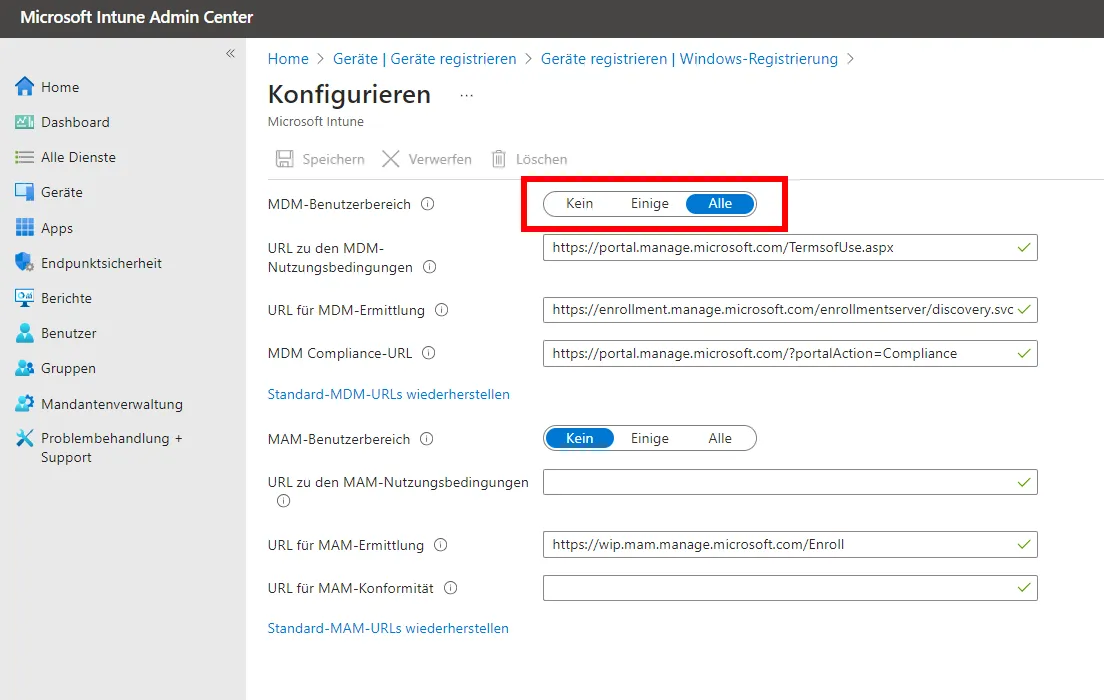 - Stellen Sie sicher, dass der MDM-Benutzerbereich in Intune nicht auf “Kein” gesetzt ist. Wenn eine Gruppe verwendet wird, stellen Sie sicher, dass das Benutzerkonto, bei dem der Fehler auftritt, Teil dieser Gruppe ist.