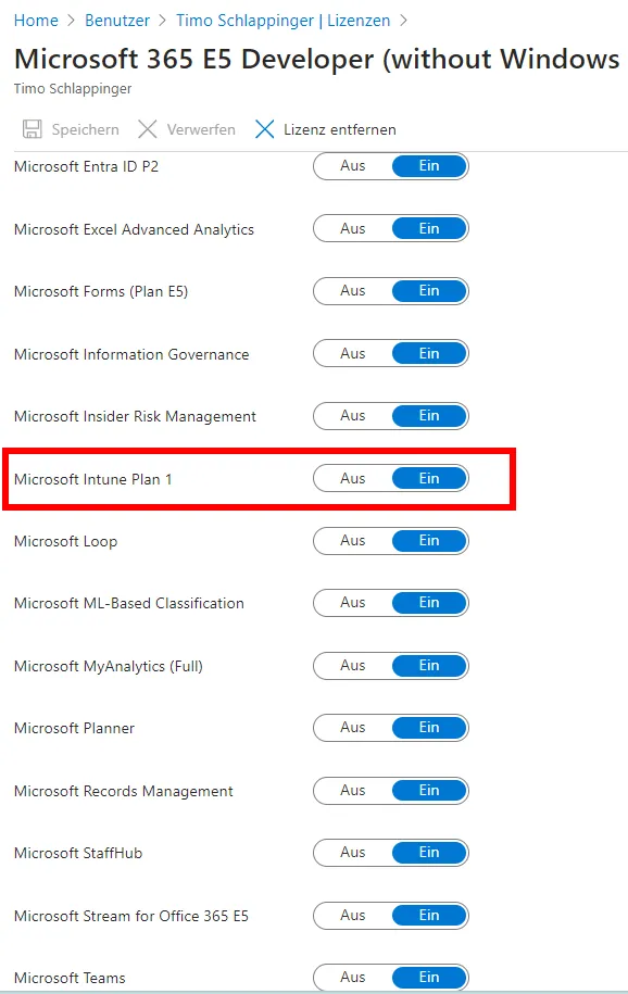 - Stellen Sie sicher, dass das Benutzerkonto über eine Intune-Lizenz verfügt. In meinem Fall fehlte diese, und durch Hinzufügen der Lizenz wurde das Problem behoben.