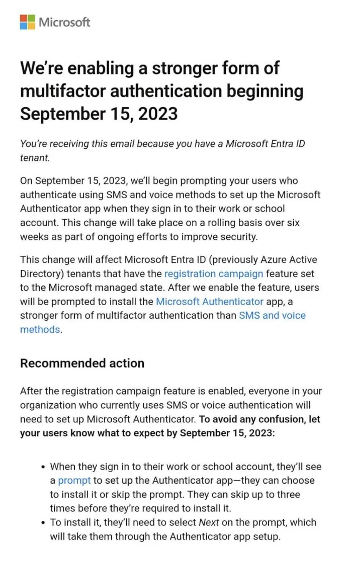Microsoft wird ab heute beginnend, die MFA Registration campaign vom Status Microsoft managed auf den Status Enabled für M365-Tenants abzuändern. Diese Änderung wird laut Microsoft in einem Zeitraum innerhalb der nächsten 6 Wochen durchgeführt.