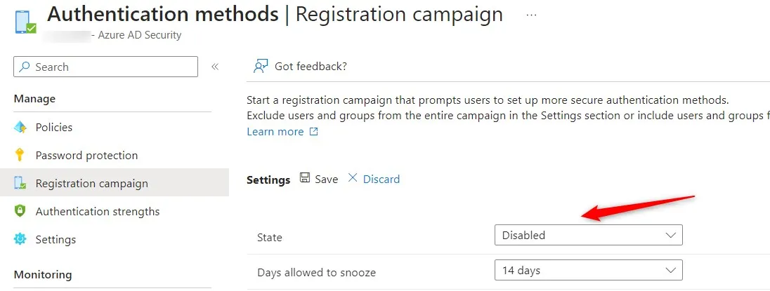 Dazu wird im Azure Portal unter Authentication methods - Microsoft Azure die Einstellung für den State auf den Wert Disabled gesetzt.