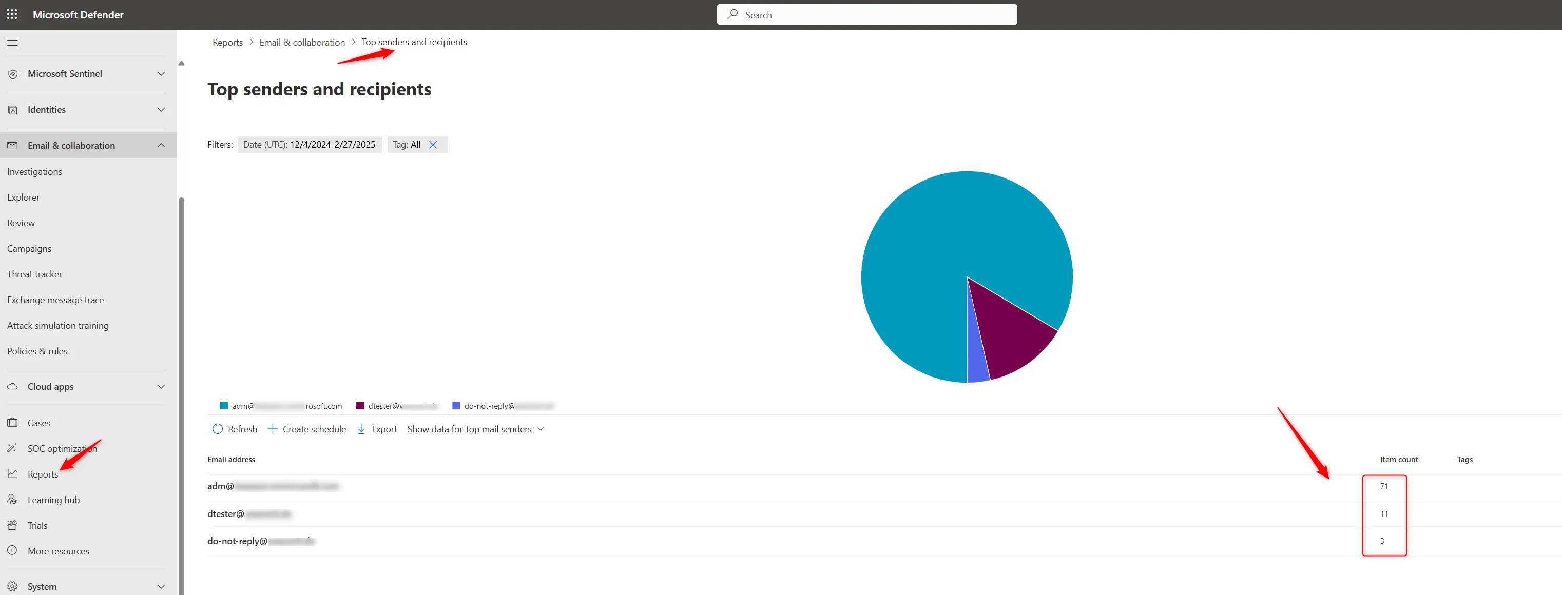 Bereits heute kann im Defender XDR-Portal eingesehen werden, welche Absender besonders viele E-Mails verschicken: