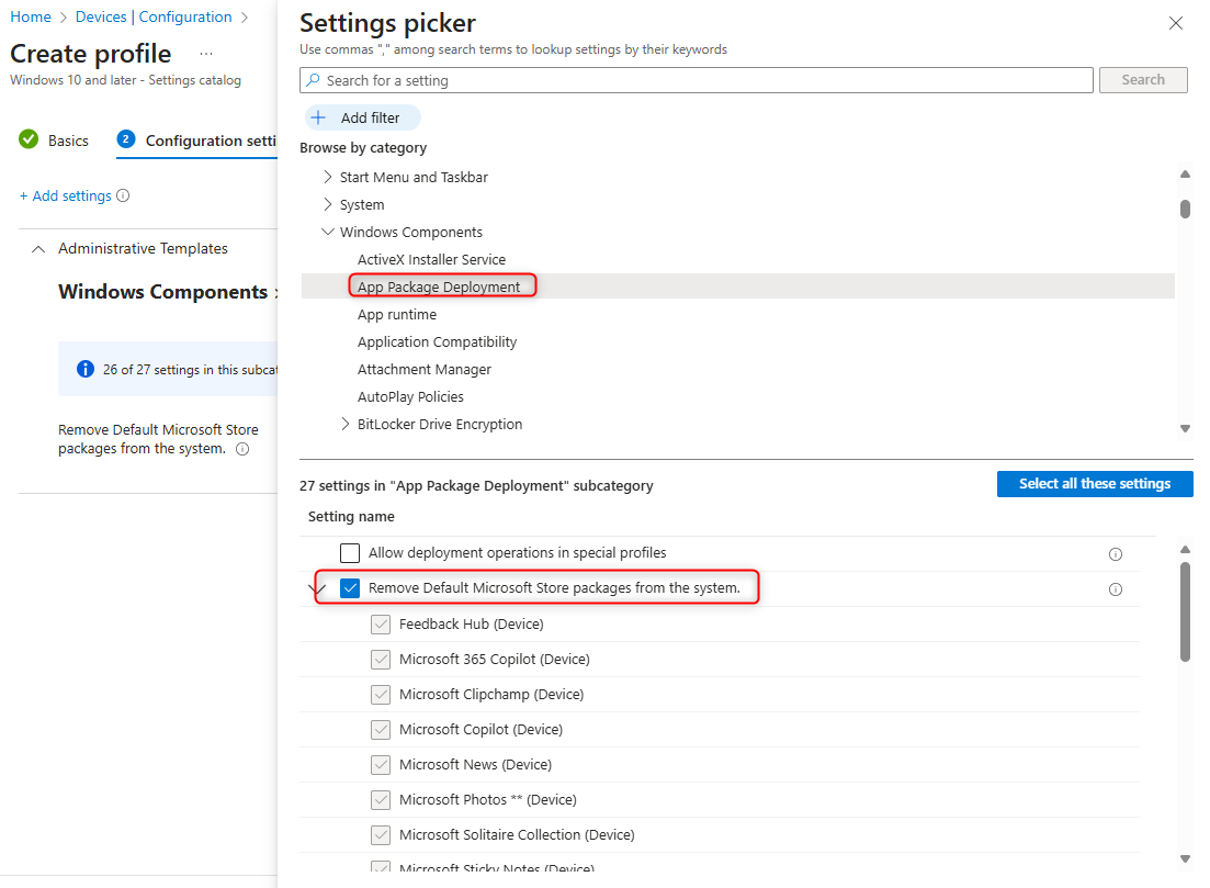 - Auswahl: Administrative Templates > Windows Components > App Package Deployment > Remove Default Microsoft Store Packages from the System