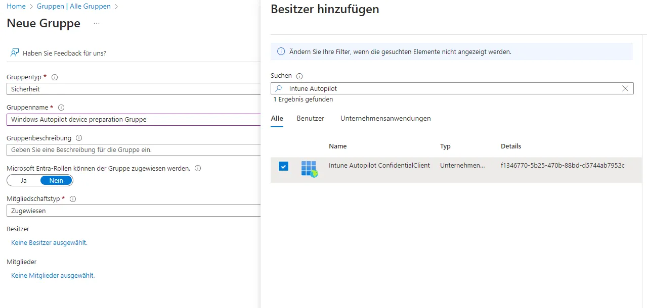 - Fügen Sie als Besitzer „Intune Autopilot ConfidentialClient“ hinzu.