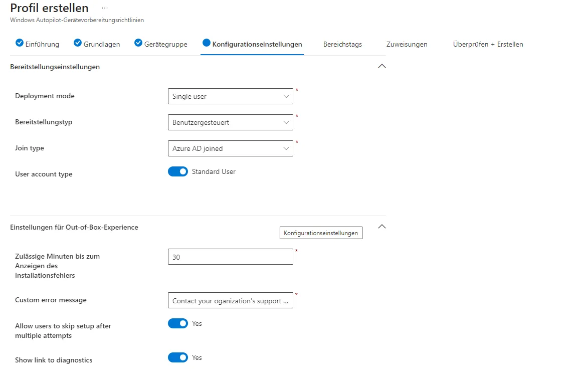 - Bei den Bereitstellungseinstellungen werden aktuell nur “Single User” / “Benutzergesteuert” und “Azure AD Joined” unterstützt. Einzig die Auswahl ob der Nutzeraccount ein Standarduser oder lokaler Admin ist, steht mir zur Verfügung.