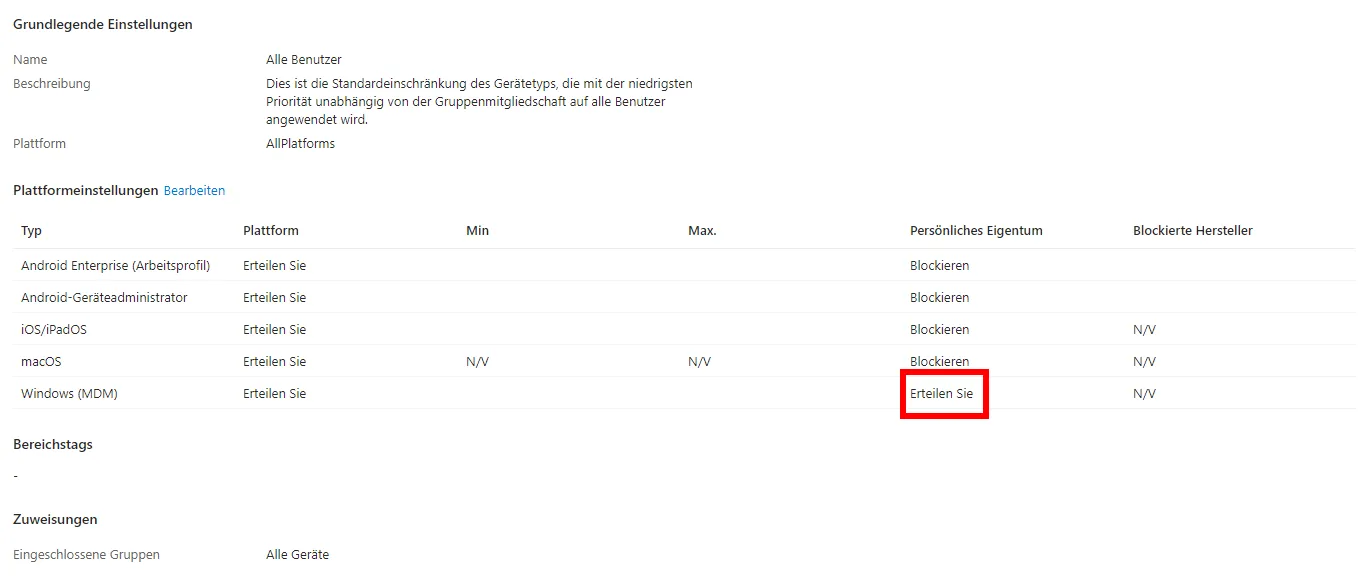 - Stellen Sie sicher, dass „Persönliche Geräte“ für Windows (MDM) erlaubt ist.