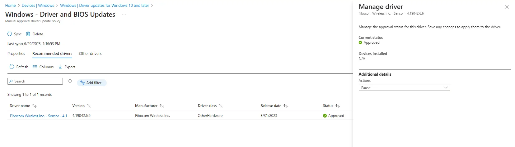 Wenn ein neues empfohlenes Update ein älteres empfohlenes Treiberupdate ersetzt, wird das ältere Treiberupdate in die Liste der anderen Treiber verschoben, bleibt jedoch genehmigt. Diese Änderung des Speicherorts der Treiberliste ist wichtig, da Windows Update nur die neueste genehmigte Version eines Treiberupdates in einer Richtlinie bereitstellt. Wenn jedoch die neueste genehmigte Version angehalten wird, stellt Windows Update die nächstaktuelle Version des Treiberupdates bereit, die weiterhin genehmigt und auf ein Gerät anwendbar ist.