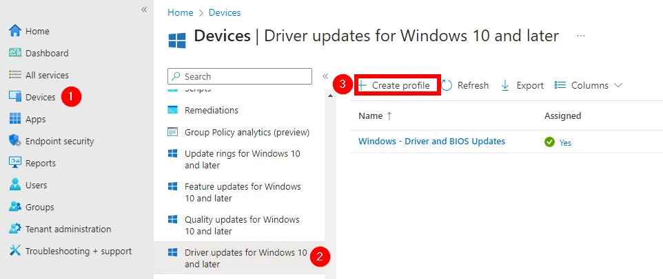 - Melden Sie sich beim Microsoft Intune Admin Center an, wechseln Sie zu Geräte > Windows-Treiberupdates >für Windows 10 und höher (Vorschau), und wählen Sie Profil erstellen aus.