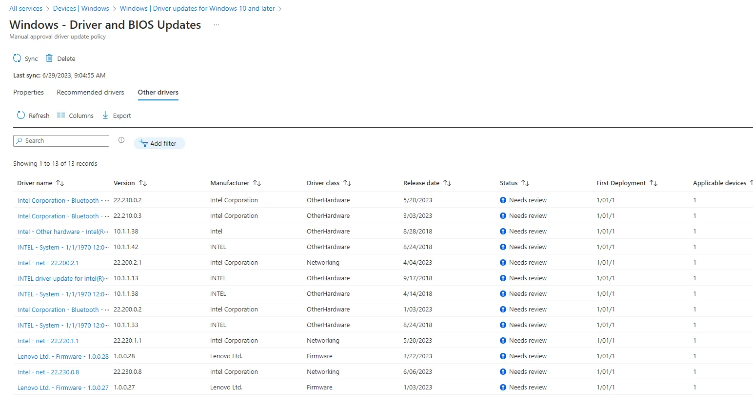 - Überprüfung erforderlich: Dieser status wird verwendet, um neue Treiber zu identifizieren, die einer Richtlinie hinzugefügt wurden. Für Richtlinien, die eine manuelle Genehmigung verwenden, gilt die Überprüfung der Anforderungen sowohl für neue empfohlene Treiber als auch für neue andere Treiber. Wenn ein Administrator die neuen Updates nicht explizit genehmigt, werden sie nicht auf Geräten bereitgestellt.