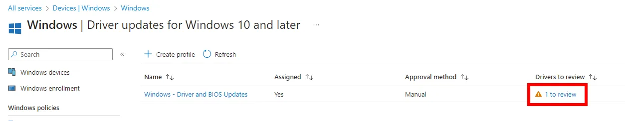 Überprüfen Sie in der Liste der Windows-Treiberupdaterichtlinien die Spalte Zu überprüfende Treiber auf Einträge, die darauf hinweisen, dass der Richtlinie neue Updates hinzugefügt wurden, die Sie möglicherweise für die Bereitstellung überprüfen und genehmigen möchten.