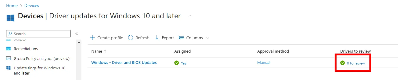 Wenn Sie die Liste der Treiberupdaterichtlinien im Admin Center überprüfen, können Sie Richtlinien identifizieren, für die neue Treiber hinzugefügt wurden, indem Sie die Spalte Zu überprüfende Treiber auf Hinweise auf neue Updates überprüfen, die überprüft werden müssen.
