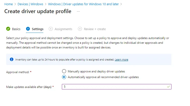 - Richtlinien mit automatischer Genehmigung: Alle neuen empfohlenen Treiberupdates werden automatisch als Genehmigt konfiguriert und ersetzen alle vorhandenen empfohlenen Treiberupdates für denselben Treiber. Nach der automatischen Genehmigung unterliegt das Update dem Zurückstellungszeitraum der Richtlinie, bevor es auf einem Gerät installiert werden kann.