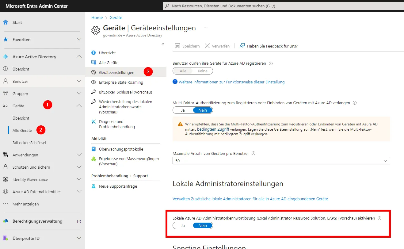 Um die Implementierung von Azure AD LAPS zu unterstützen, müssen Sie zunächst Windows LAPS für Azure AD im Azure AD Management Portal aktivieren. Führen Sie dazu einfach die folgenden Schritte aus: