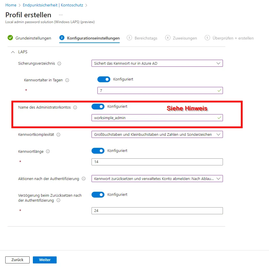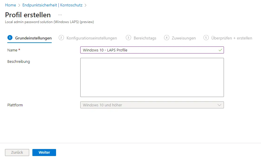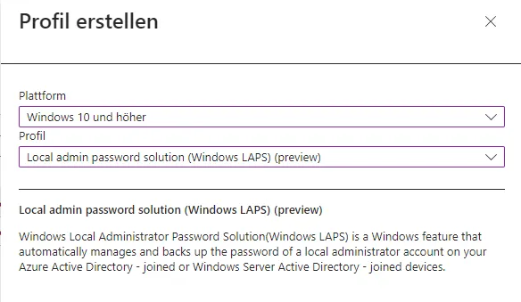 Nachdem LAPS für Ihren Tenant aktiviert wurde, können Sie nun ein Konfigurationsprofil erstellen, das alle Einstellungen für Azure AD LAPS enthält, die auf Ihre Geräte angewendet werden sollen.