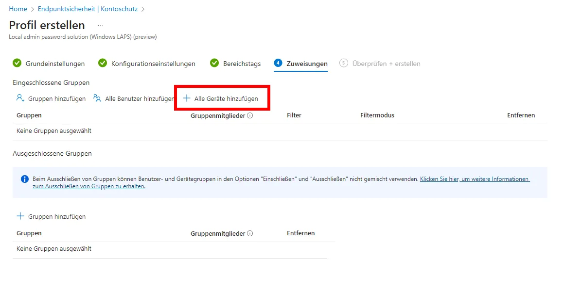 - Klicken Sie auf Alle Geräte hinzufügen, um diese Richtlinie auf alle unterstützten Geräte anzuwenden, die in Intune registriert sind. Sie können hier auch beliebige Gerätefilter definieren, um bestimmte Geräte von der Azure AD LAPS-Richtlinie auszuschließen. Klicken Sie dann auf Weiter.