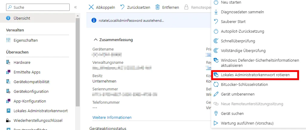 Um das Kennwort vor der festgelegten Ablaufzeit zu ändern, wählen Sie das Gerät in Intune aus, klicken Sie auf die 3 Punkte oben rechts und dann auf Lokales Administratorkennwort ändern.