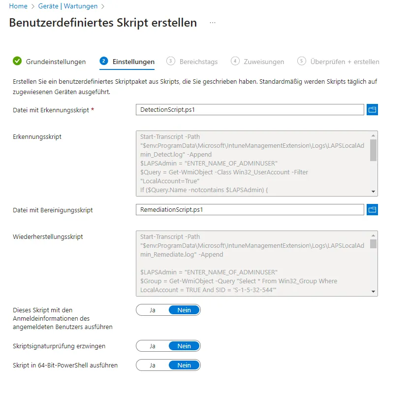 Das Erkennungsskript erkennt, ob der Windows LAPS-Benutzer bereits vorhanden ist, und das Remediationsskript erstellt den Benutzer und fügt ihn der Gruppe der lokalen Administratoren hinzu.