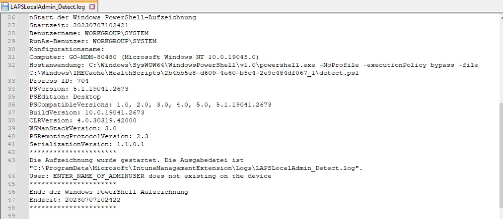 Es wäre einfacher mit dem Microsoft.PowerShell.LocalAccounts PowerShell Modul gewesen, aber leider kann dies nicht im Systemkontext genutzt werden, da dann nicht auf die lokale Administratorengruppe zugegriffen werden kann. Daher musste ich CMD-Befehle verwenden, um den Benutzer zu erstellen und ihn zu den lokalen Administratoren hinzuzufügen. Ich nutze an für die lokale Admingruppe nicht die Bezeichnung, sondern die SID der Gruppe (SID = ‘S-1-5-32-544), da die Bezeichnung der Gruppe für jede Lokalisierung anders lautet und ich das Skript auf allen OS Sprachen nutzen möchte.