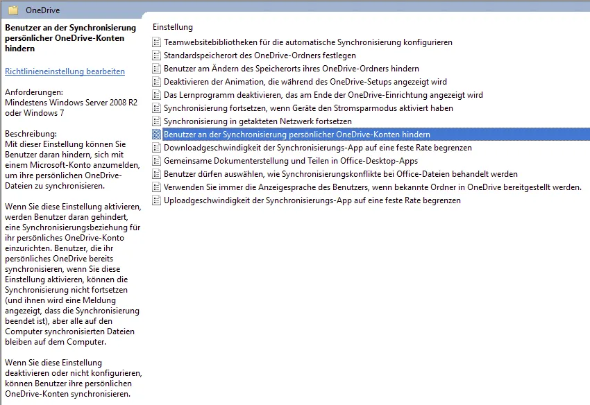 Diese Richtlinie blockiert vollständig die Synchronisierung persönlicher OneDrive-Konten.