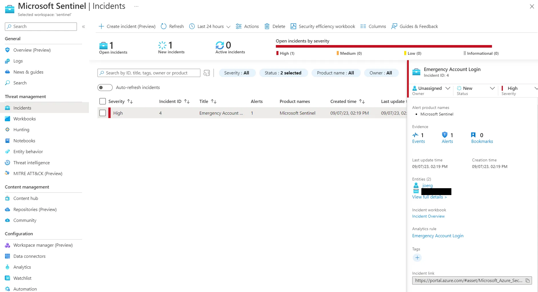Zum Testen der Konfiguration kann man sich mit dem Account aus der Analytic Rule anmelden, oder dort einen Testaccount hinterlegen. Wenn alles funktioniert sieht das Ergebnis wie folgt aus, und es sollte eine E-Mail Notification gesendet worden sein.