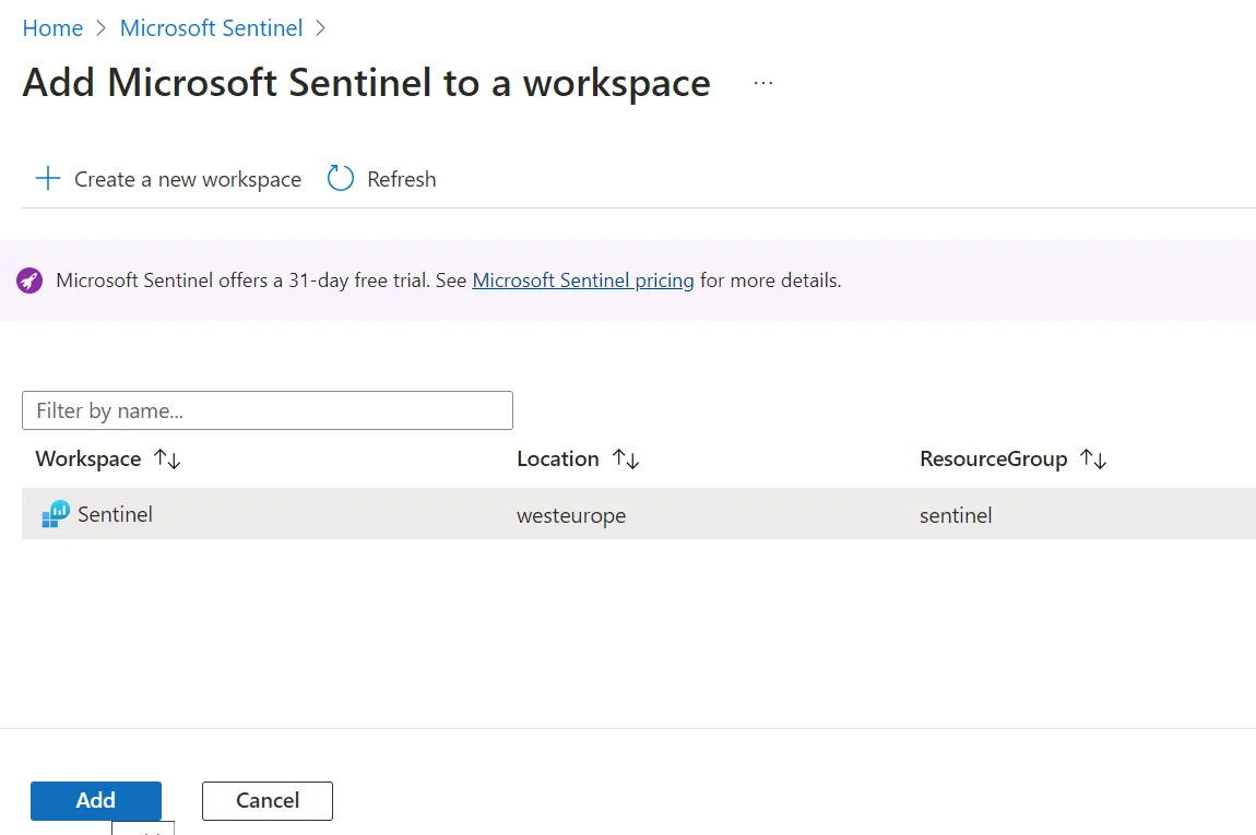 - Füge Microsoft Sentinel dem Log Analytics Workspace hinzu