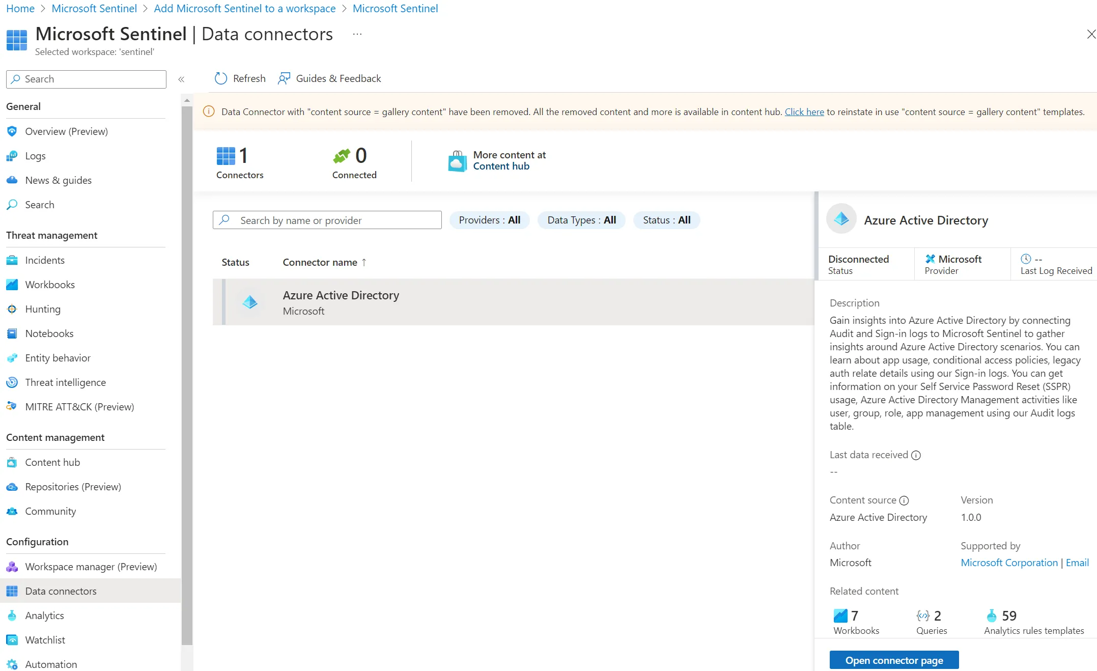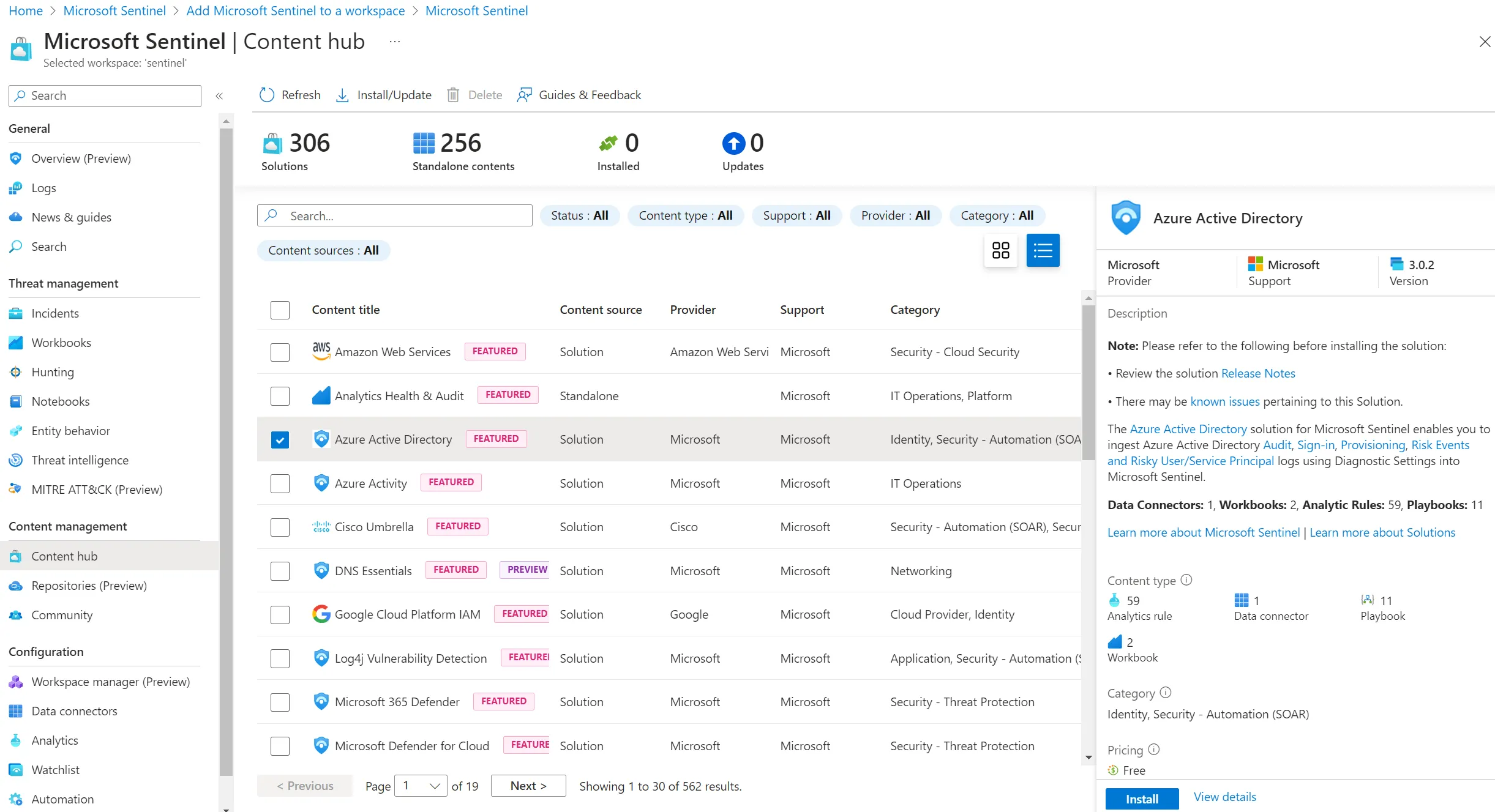 - Microsoft Sentinel > Content Hub > Azure Active Directory > Install