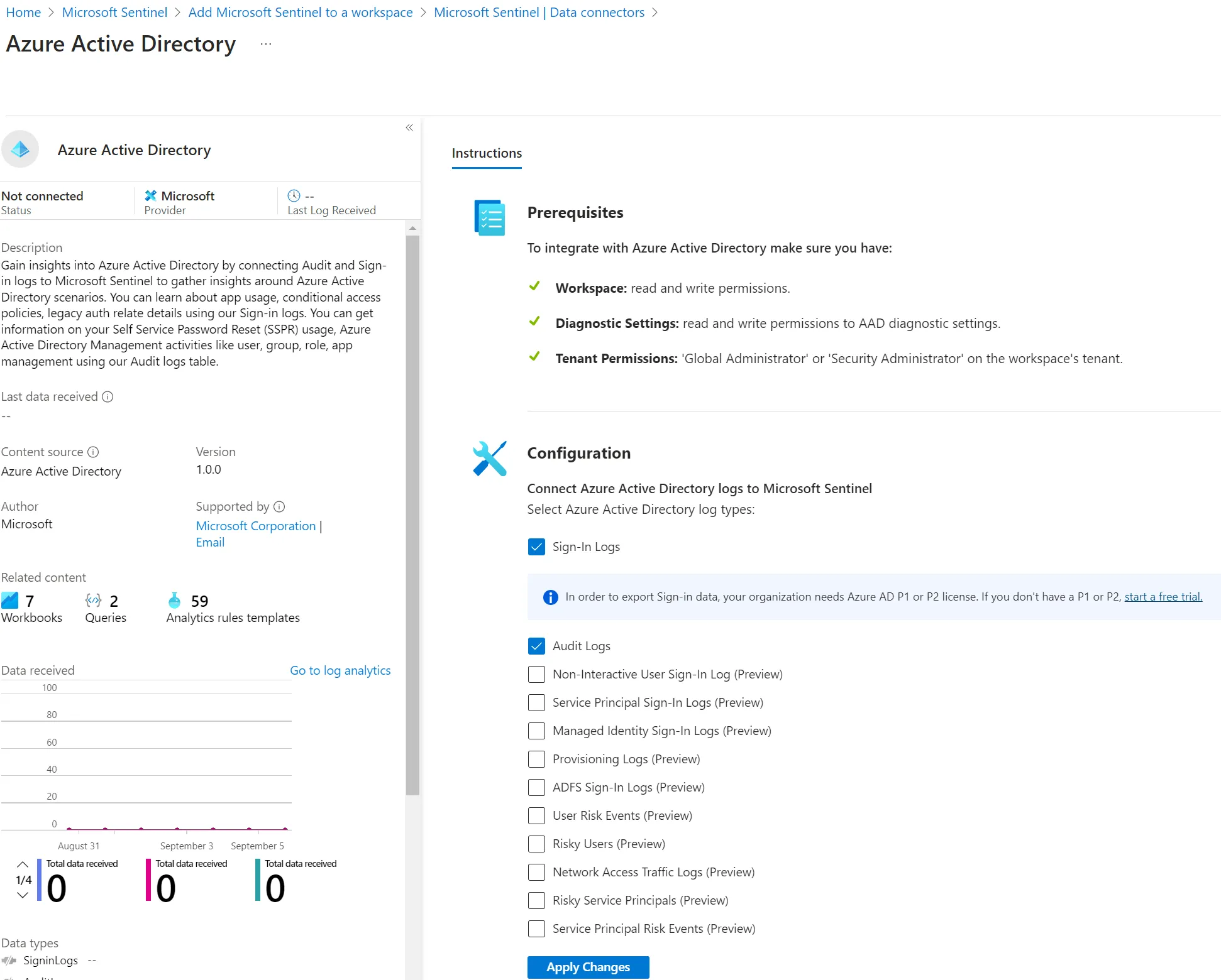 - Connector konfigurieren: Microsoft Sentinel > Data Connectors > Azure Active Directory > Open Connector Page
