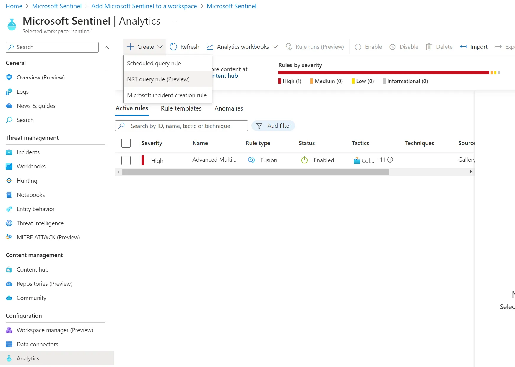 - Microsoft Sentinel > Analytics > Create > NRT query rule