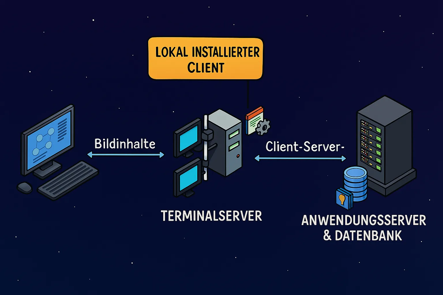 Virtual Desktop Infrastructure, kurz VDI, löst genau das. Die Desktop-Umgebung läuft zentral auf sogenannten Terminalservern direkt neben der App im Rechenzentrum. Ein Terminalserver ist ein zentraler Server, auf dem mehrere Benutzer gleichzeitig arbeiten, indem sie sich über das Netzwerk mit einer virtuellen Sitzung verbinden. Nutzer greifen also über das Netzwerk auf ihre gewohnte Arbeitsumgebung zu, während Anwendungen direkt auf dem Server ausgeführt werden. Vergleichbar ist dies mit Netflix, wo Filme zentral gespeichert und nur gestreamt werden.