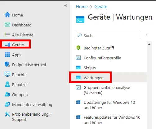 Melden Sie sich am Intune-Portal an und gehen Sie zu Geräte und anschließend zu Wartungen: