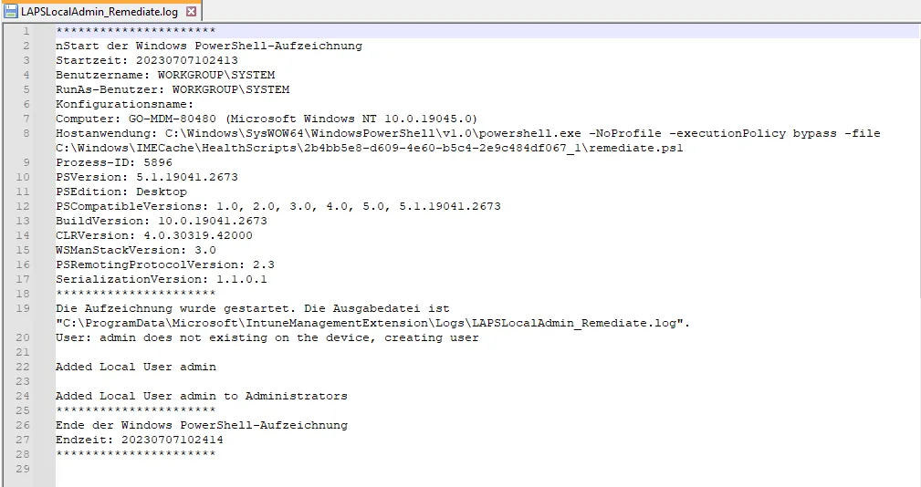 Es wäre einfacher mit dem Microsoft.PowerShell.LocalAccounts PowerShell Modul gewesen, aber leider kann dies nicht im Systemkontext genutzt werden, da dann nicht auf die lokale Administratorengruppe zugegriffen werden kann. Daher musste ich CMD-Befehle verwenden, um den Benutzer zu erstellen und ihn zu den lokalen Administratoren hinzuzufügen. Ich nutze an für die lokale Admingruppe nicht die Bezeichnung, sondern die SID der Gruppe (SID = ‘S-1-5-32-544), da die Bezeichnung der Gruppe für jede Lokalisierung anders lautet und ich das Skript auf allen OS Sprachen nutzen möchte.